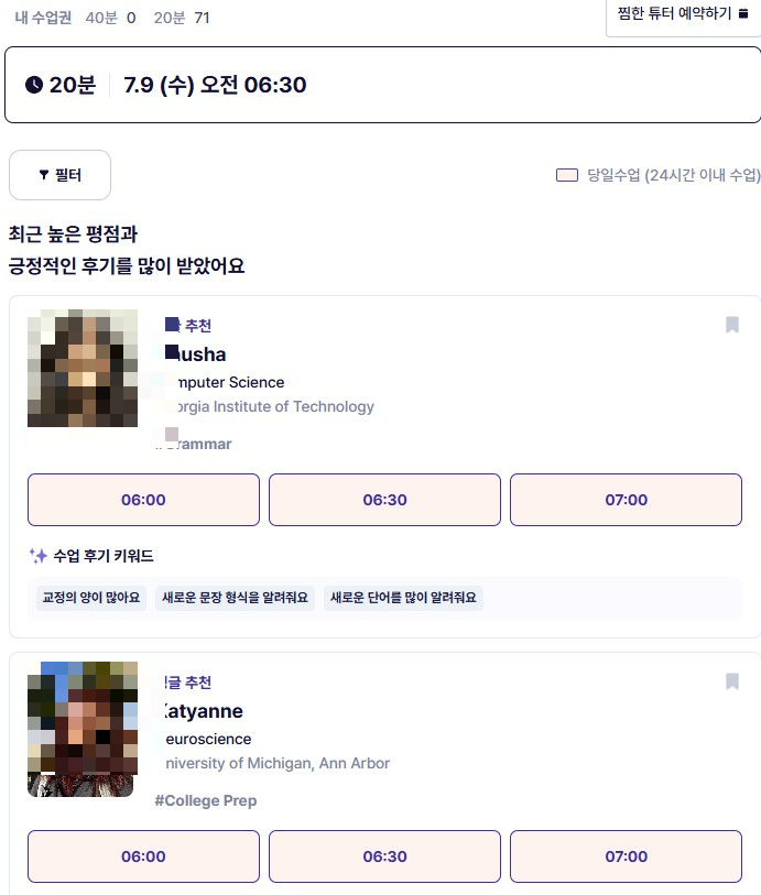 아래처럼 날짜와 시간을 선택하면, 그 날짜와 시간에 예약이 가능한 튜터(강사) 리스트가 나옵니다. 여기서 튜터(강사)들의 키워드와 후기, 성별, 출신대학, 자기소개를 보고 종합적으로 판단해서 선택합니다.