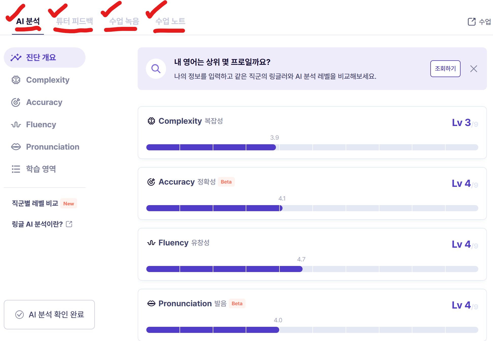 수업 후 링글의 특별한 서비스 : 나의 영어 실력 진단과 유용한 정보