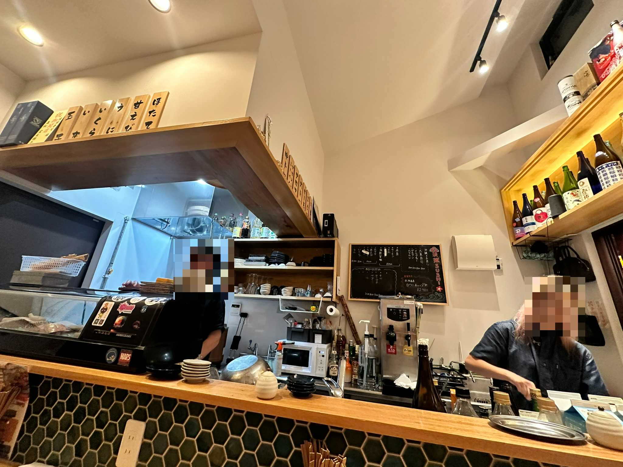 일본은 작은 식당들이 참 많다. 그럼에도 불구하고 있을 건 다 있다. 소규모의 식당이다 보니, 주문한 즉시 제조가 되고 맛은 더욱 좋아질 수 밖에 없을 것 같다는 생각이 들었다. 하지만 단점은 테이블이 몇 개 없기 때문에 유명해진다면 기다림은 피할 수 없다는 점이다. 우리가 이번에 방문한 오키나와 국제거리 시장에 위치한 류큐 스시집도 테이블이 6개 정도만 있었던 것 같다. 가게 바로 앞에 야외 테이블이 하나 있었던 것 같은데, 거기에서는 더워서 먹기가 어렵다. 우리가 방문했을 때, 이미 2명 손님이 있었고 운 좋게도 4자리가 남아서 바로 앉을 수 있었다. 우리가 방문한 시간은 8시 30분 정도였다. 저녁시간이 지나고 나서 방문했다. 쇼핑을 먼저 하다 보니 시간 가는 줄 몰랐기 때문이다. 이 스시집은 부부처럼 보이시는 두 분이 운영을 하고 계셨다. 남자분이 스시 요리사였고, 여자분이 서빙과 주문을 담당하셨다. 여성분은 영어를 거의 못하셨고, 대신 남성분은 영어를 좀 할 줄 아셔서 우리가 주문하는데 어려움은 없었다. 가장 좋았던 점은 정말 너무 친절하셨다. 난 식당의 친절함은 맛을 더욱 좋게 만든다고 믿는 입장이다. 아무리 맛집을 가도 직원이 불친절하면 절대 재방문하지 않는다. 친절함이 곧 음식에 대한 신뢰라고 생각하기 때문이다.