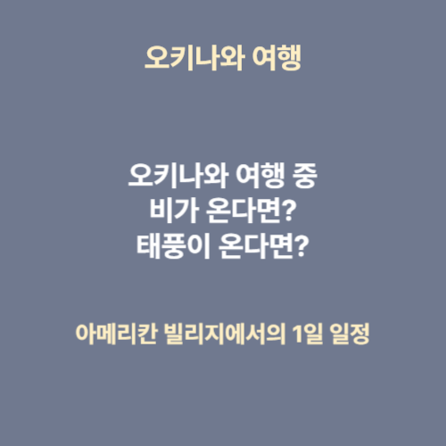 4박 5일 오키나와 여행 중에 2일이 비가 왔어요. 하루는 태풍으로 인해 비와 바람이 강하게 왔어요. 하지만 오히려 비가 많이 왔던 그날의 즐거웠던 추억이 오래도록 기억에 남네요. 저와 같이 맑고 푸른 하늘과 밝은 햇살을 기대하고 갔지만 비가 와서 무엇을 하면 좋을지 고민하는 분들을 위해 제가 즐겁게 보냈던 오키나와 태풍 여행 일정을 공유하고자 해요.