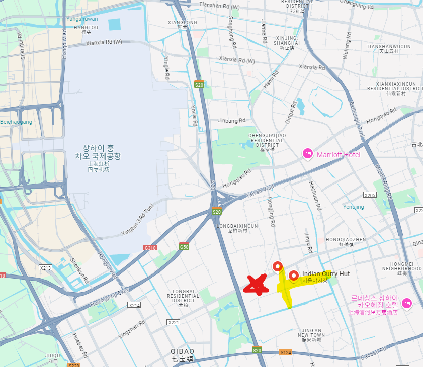 그리고 무엇보다 한인타운이라 할 수 있는 홍차오 한인거리도 도보로 모두 이용 가능합니다. (노란색 표시 부분)