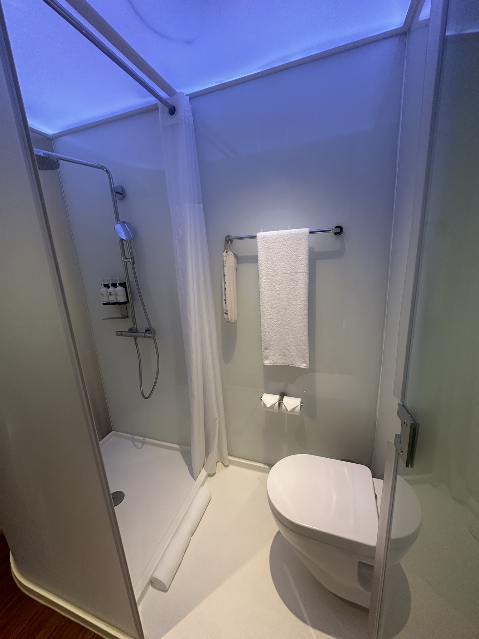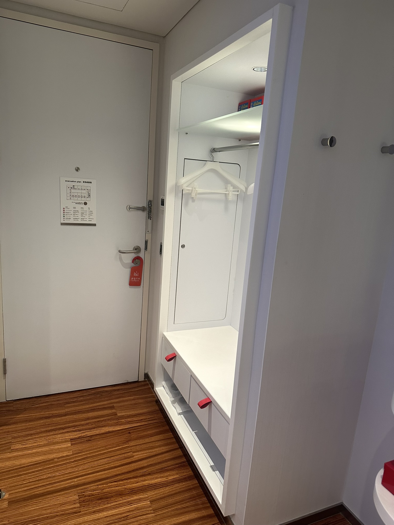 방은 작아도 있을 것은 다 있어요. 옷장도 있고, 금고, 샤워실, 화장실, 세면대 모두 잘 구비되어 있어요